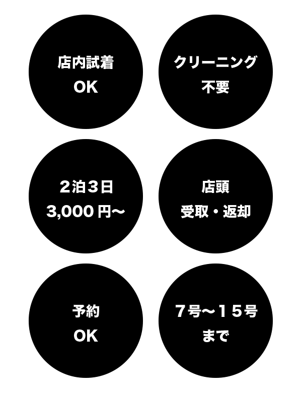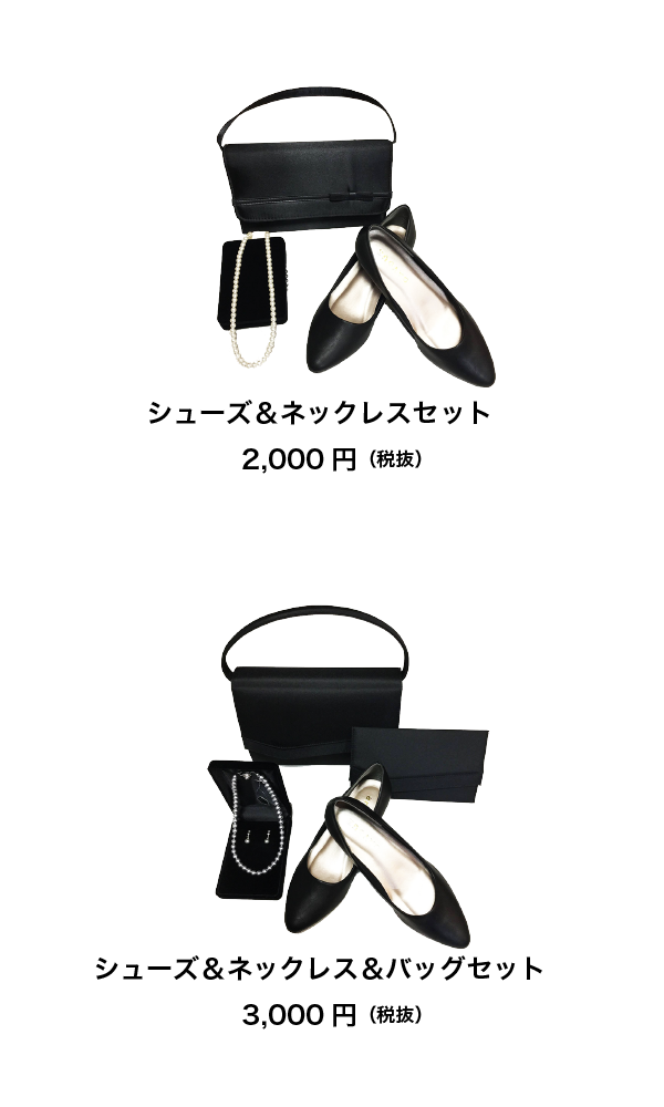 上記の商品の価格にプラス2000円/3000円で小物のレンタルも可能です。 店頭にてご試着いただけます。